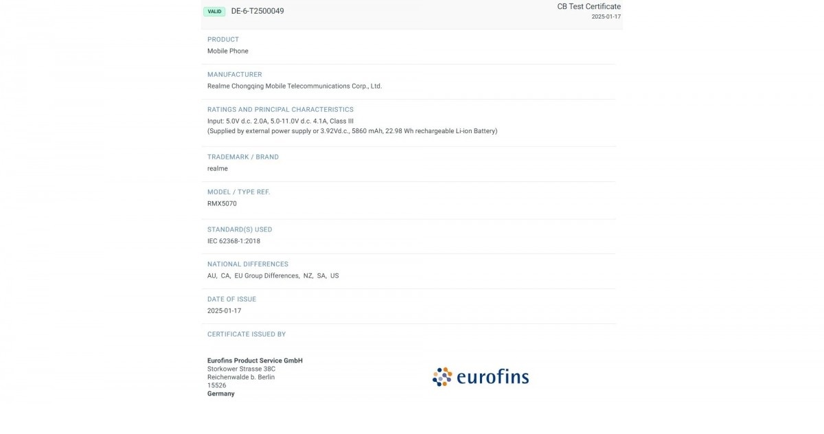 بر اساس گواهینامه جدیدی که این دستگاه دریافت کرده است، مشخص شده که Realme P3 به یک باتری 5860 میلیآمپر ساعتی مجهز خواهد بود. البته هنوز مشخص نیست که این ظرفیت باتری اسمی است یا ظرفیت واقعی. در صورتی که ظرفیت اسمی باشد، میتوان انتظار داشت که ظرفیت تبلیغاتی آن به 6000 میلیآمپر ساعت برسد.