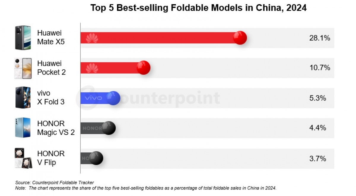 بر اساس تحلیل بازار گوشیهای هوشمند تاشو در چین که توسط شرکت کانترپوینت انجام شده، این بازار در سال ۲۰۲۴ رشد ثابتی را تجربه کرده است. اگرچه گوشیهای تاشو تنها ۳ درصد از کل فروش گوشیهای هوشمند در این کشور را تشکیل میدهند، اما رشد ۲۷ درصدی نسبت به سال ۲۰۲۳ بسیار چشمگیر است.